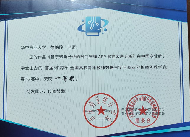 数学与统计学系教师徐艳玲获初赛优秀教学设计奖,并在决赛中斩获全国一等奖。