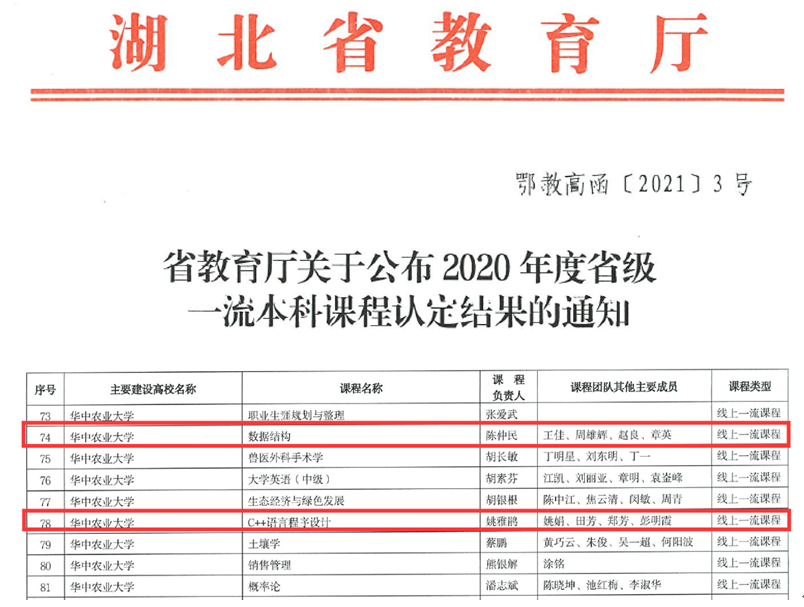 (图文|王立金)近日,湖北省教育厅发布《关于公布2020年度省级一流本科课程认定结果的通知》,学校20门课程入选省级一流本科课程。其中,今天足球比赛比分 陈仲民教授负责的《数据结构》和雅姚鹃老师负责的《C++语言程序设计》2门课程获得线上一流本科课程认定。