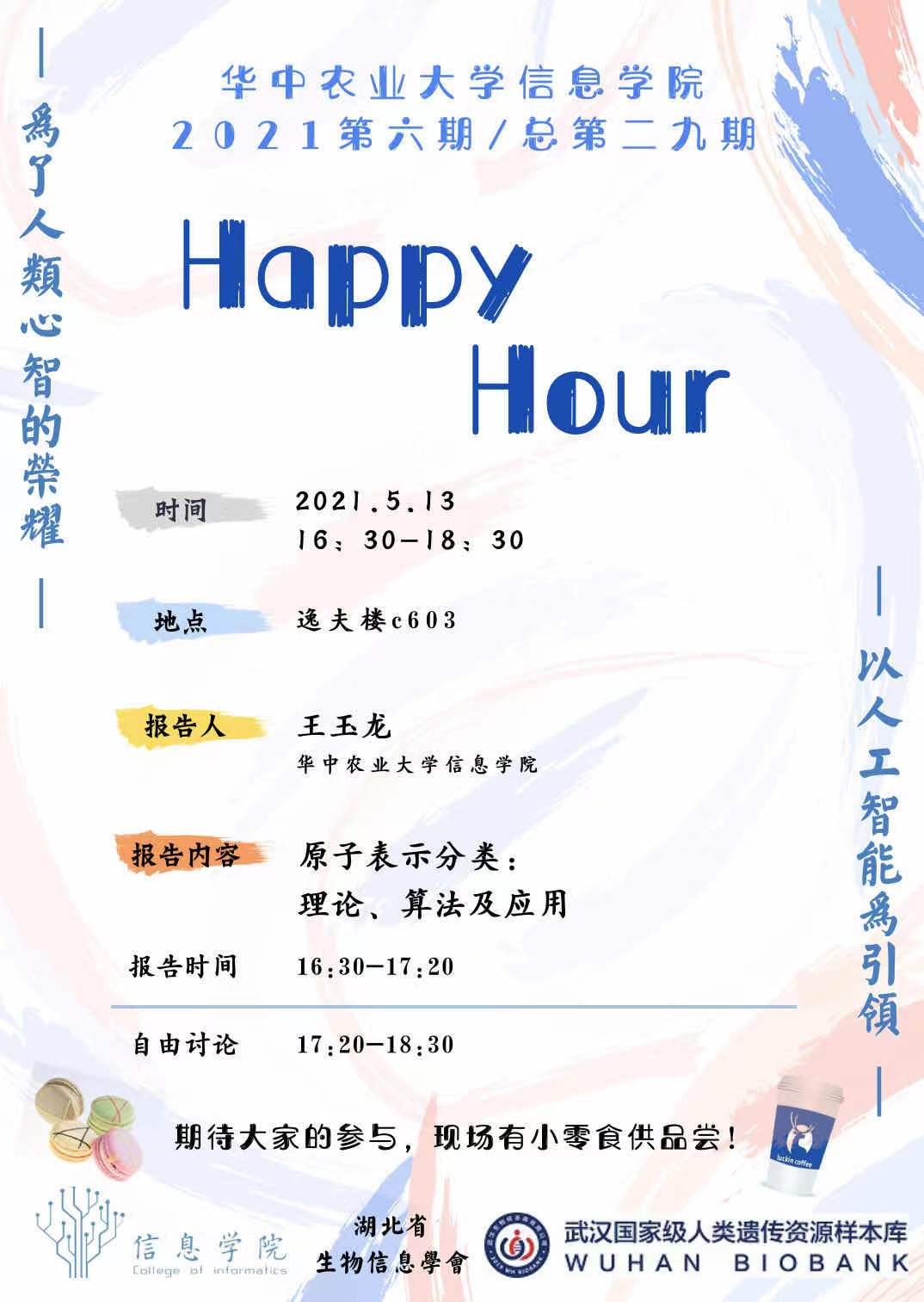 本学期第6期Happy hour活动定于5.13(周四)16:30—18:30,在逸夫楼C603会议室举行。报告人为:今天足球比赛比分 王玉龙教授,报告题目为《原子表示分类:理论、算法及应用》。欢迎参加!