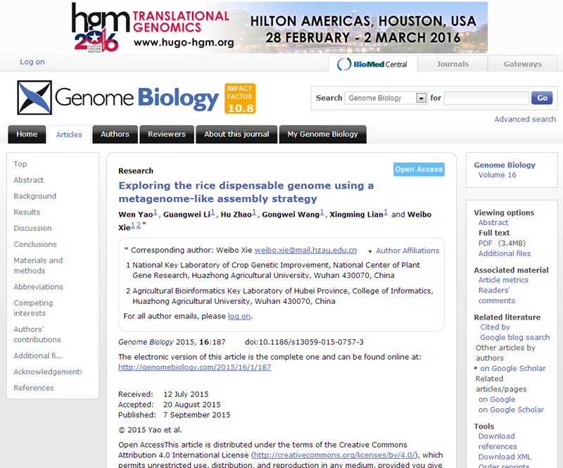 (文|作物遗传改良国家重点实验室 卓重)近日,《Genome Biology》(《基因组生物学》,IF: 10.8)在线发表了我校作物遗传改良国家重点实验室水稻团队在水稻基因组研究中取得的新进展。论文以“Exploring the rice dispensable genome using a metagenome-like assembly strategy”(使用宏基因组序列拼接策略探索水稻非必需基因组)为题,基于1483份水稻品种的低覆盖度基因组测序数据,开发创新的分析策略探究了水稻“非必需基因组”的构成及其潜在功能。谢为博副教授为该论文的通讯作者,博士生姚文为第一作者。该杂志同时配发了亮点评论“Harvesting rice’s dispensable genome”(收获水稻非必需基因组),高度评价了该研究的科学意义和应用价值。