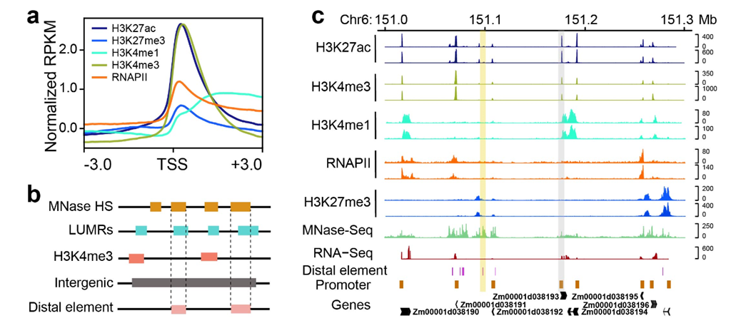 玉米基因组中超过80%序列都位于基因间区,其中包含许多已经鉴定的影响重要农艺形状的遗传变异,比如已经验证的部分调控元件,有促进玉米植株花青素合成基因b1, 影响玉米分蘖的tb1和控制开花期的vgt1和ZmCCT9等。但是,玉米中这些位于基因间区的顺式调控元件影响基因表达的机制尚不清楚。