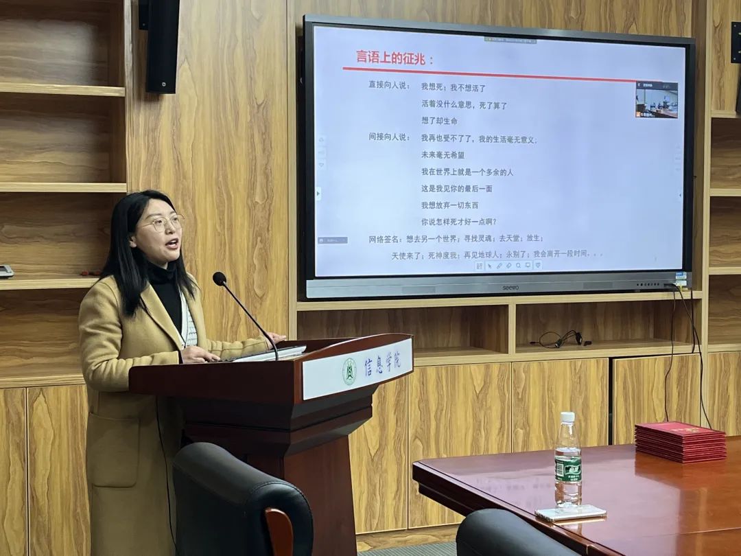 首先,来自心理健康教育中心的康素杰老师开展了主题为大学生心理危机识别与干预的培训讲座。康老师分别从心理危机定义、心理危机预防、心理危机识别和心理危机干预四个方面进行了讲述。面对学生成长过程中的各种心理危机,她建议班主任老师准确识别,做好安全监护,家校协同为危机学生搭建起全面的社会支持系统。
