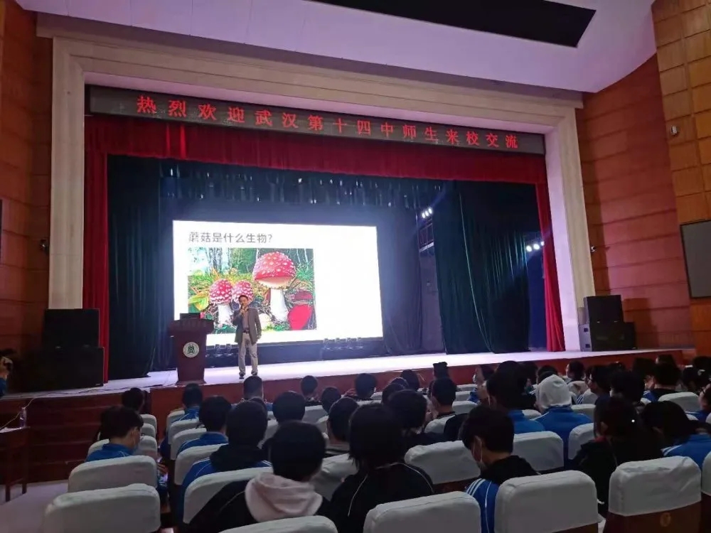 华中农业大学龚钰华老师为十四中师生带来《蘑菇与人类生活》的专题讲座。首先,他通过提出“蘑菇是什么生物”的问题开始,与十四中师生进行互动交流;随后,龚钰华围绕自然界的蘑菇、蘑菇的生活方式、中国蘑菇产业现状、食用真菌的活性成分及药理作用等方面进行科普,通过深入浅出的语言,介绍蘑菇和人类生活的密切关系。