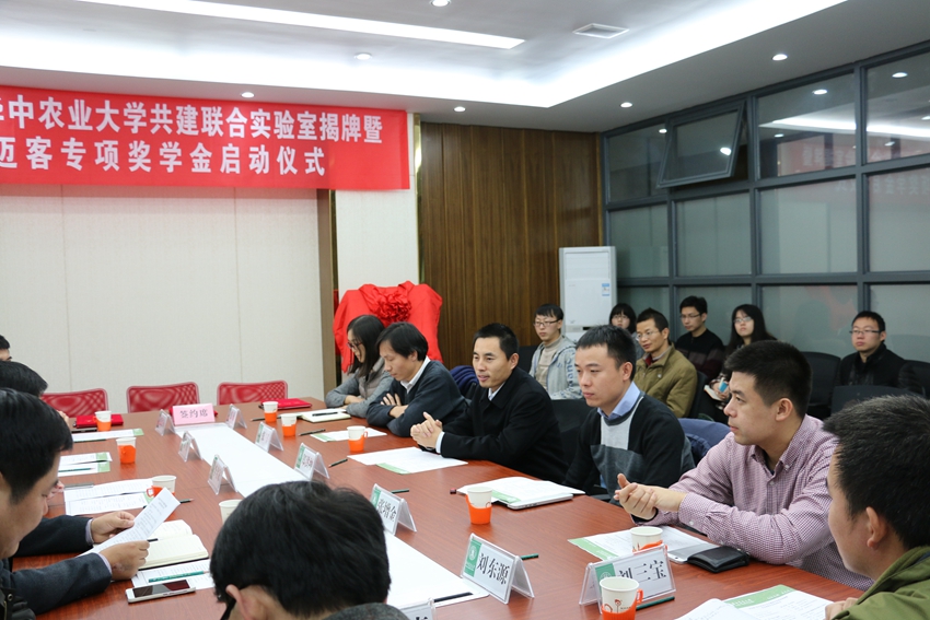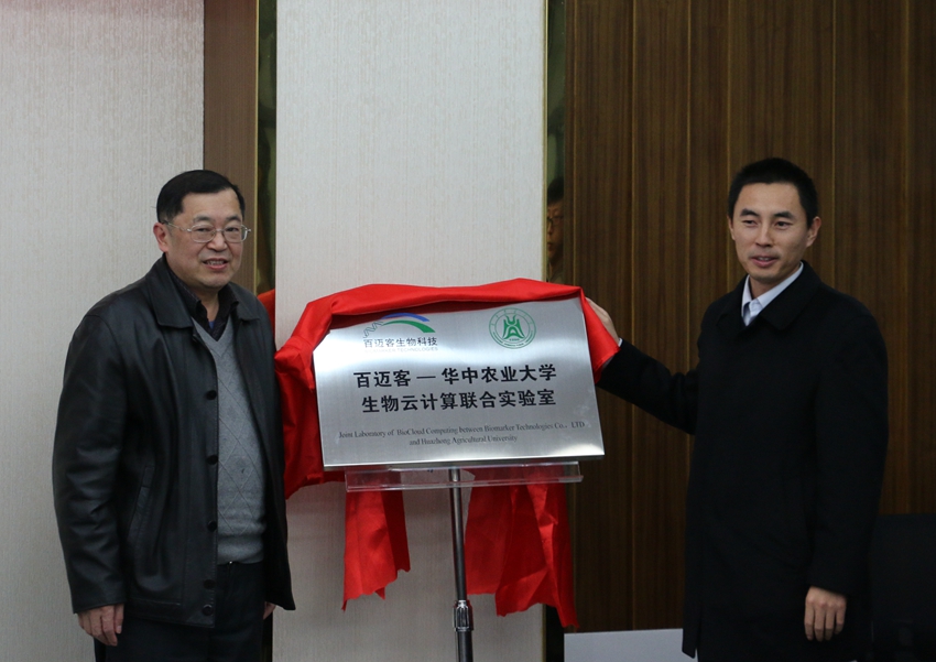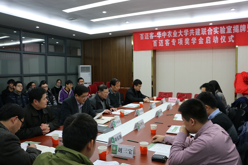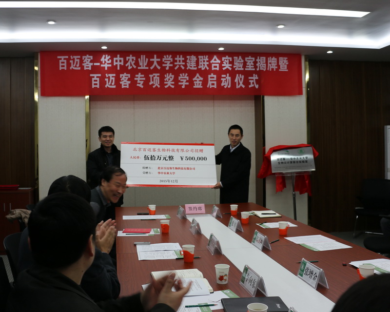 张红雨、陈胜、郑洪坤共同签订了《百迈客-华农捐赠协议》。根据协议,北京百迈客生物科技有限公司出资50万在我校设立奖学金,资助品学兼优的学子。陈胜为郑洪坤颁发了捐赠证书。随后,李名家和郑洪坤为共建联合实验室揭牌。郑洪坤先生为周珂、申利军等18位获奖学生颁奖。