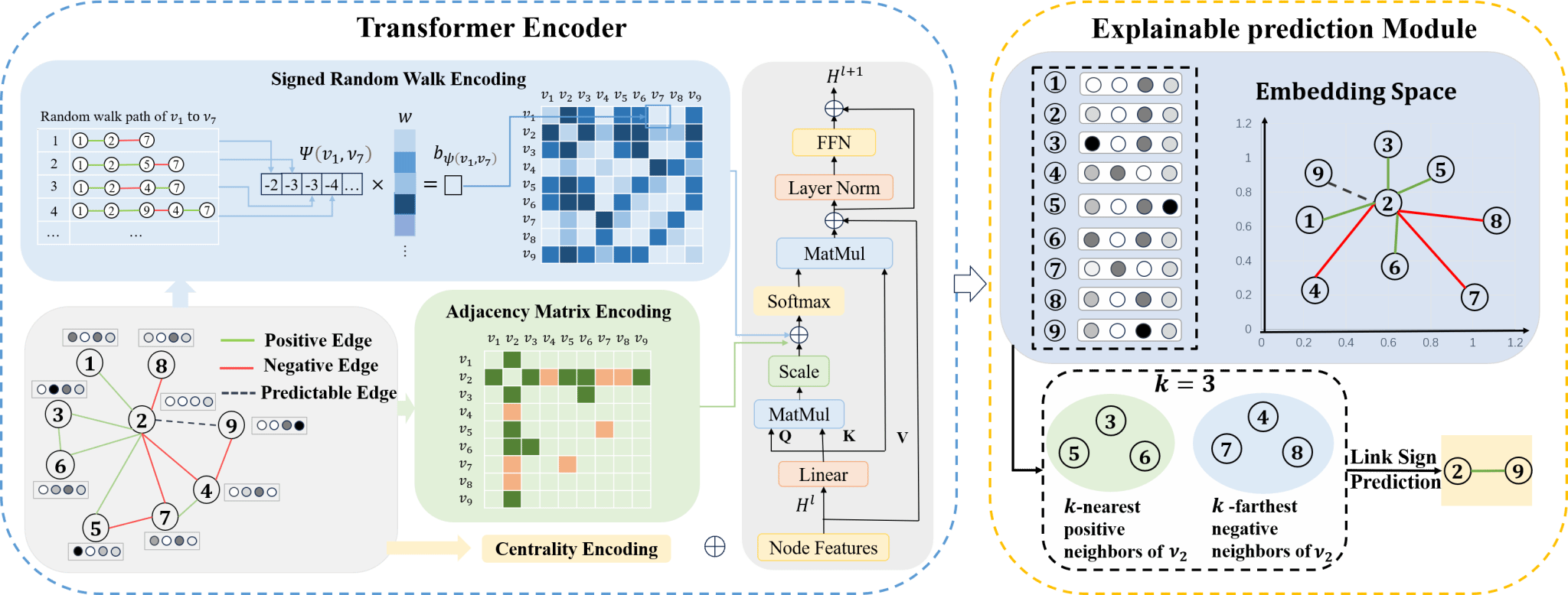 本研究首次关注符号图神经网络的可解释性问题,提出了一种新的符号图表示学习框架——SE-SGformer。该框架不仅能确保较高预测精度,还能提供明确的决策解释。研究表明,通过引入符号随机游走的位置编码,该方法在表达能力上超过现有的符号图神经网络SGCN和基于最短路径编码的graph transformer方法。此外,该论文还提出一种新的可解释决策过程,通过发现节点的K近邻(正向或负向)来替代传统的神经网络解码器,从而为符号边的预测提供可解释的信息。