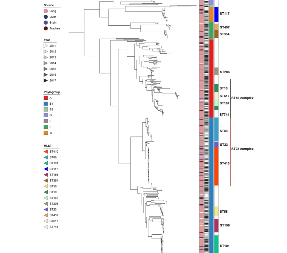 (图文|九九|兽医研圈)抗生素耐药性已成为全球公共卫生领域一大挑战。特别是肠外致病性大肠埃希菌(Extraintestinal Pathogenic Escherichia coli, ExPEC),它们不仅在人类中引起严重泌尿道感染、血流感染、新生儿脑膜炎等,且在动物中也造成显著健康和经济损失。尽管ExPEC对人类和动物健康构成的威胁日益增加,但人们对动物源ExPEC多样性、抗生素耐药性及其与人类感染的联系了解甚少。特别是在中国,作为世界上最大猪肉生产和消费国,猪源ExPEC的种群结构和耐药性特征对于理解其在公共卫生中的作用至关重要。然而目前对猪源ExPEC的系统研究相对缺乏,对其耐药基因(antibiotic resistance genes, ARGs)的传播机制和潜在公共卫生影响的认识也不够全面。因此,本研究通过对来自中国499株猪源ExPEC进行大规模基因组测序和抗生素耐药性测试,旨在揭示其种群结构、耐药性特征以及与人类病原体的关联性,为制定有效的监控和控制策略提供科学依据。