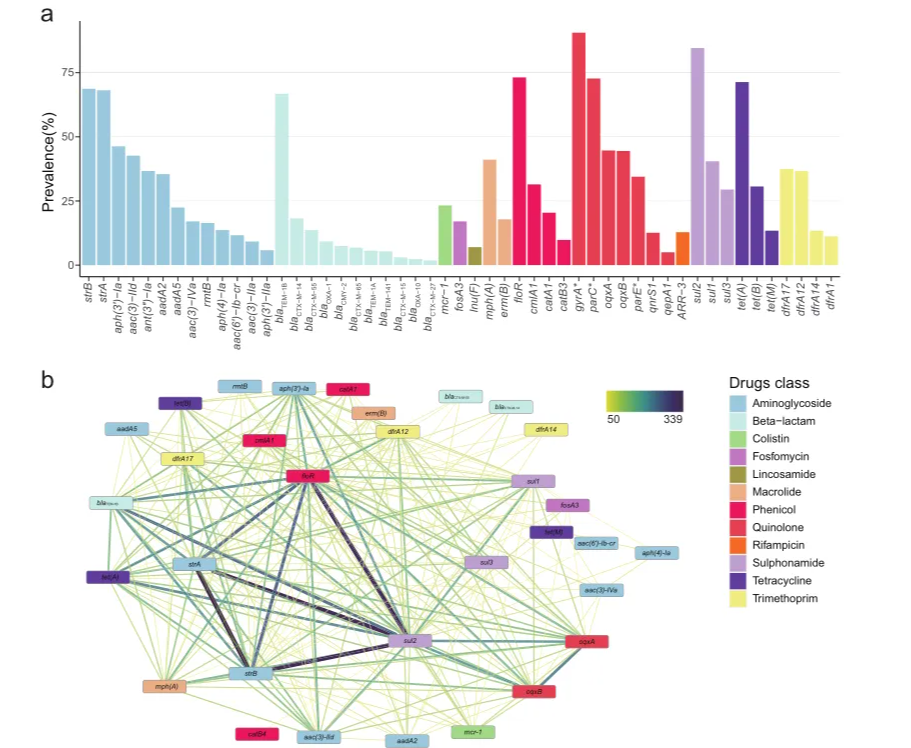 研究揭示了多重耐药(MDR)和广泛耐药(XDR)大肠杆菌的遗传决定因素。通过对492个基因组的分析,发现了406种不同的抗生素抗性基因(ARGs)组合,其中96%以上仅存在于一个或两个基因组中。这些组合平均包含13个ARGs,最多可达28个。超过三分之二的组合在超过70%的基因组中发现,表明这些基因组合与MDR表型高度相关。共现网络分析显示,sul2、floR、strA和strB构成了网络的核心,与其他ARGs有联系。这些基因的存在可能导致对氨基糖苷类、氯霉素和磺胺类药物的耐药性。同时,研究还发现β-内酰胺类、四环素类和氟喹诺酮类药物的抗性基因与针对人类药物的抗性基因(如blaCTX-M-55、blaCTX-M-14、fosA3和mcr-1)共存,这可能会加剧人类药物抗性基因的传播。此外,尽管mcr-3在少数基因组中检测到,但其与mcr-1的共现也值得关注。