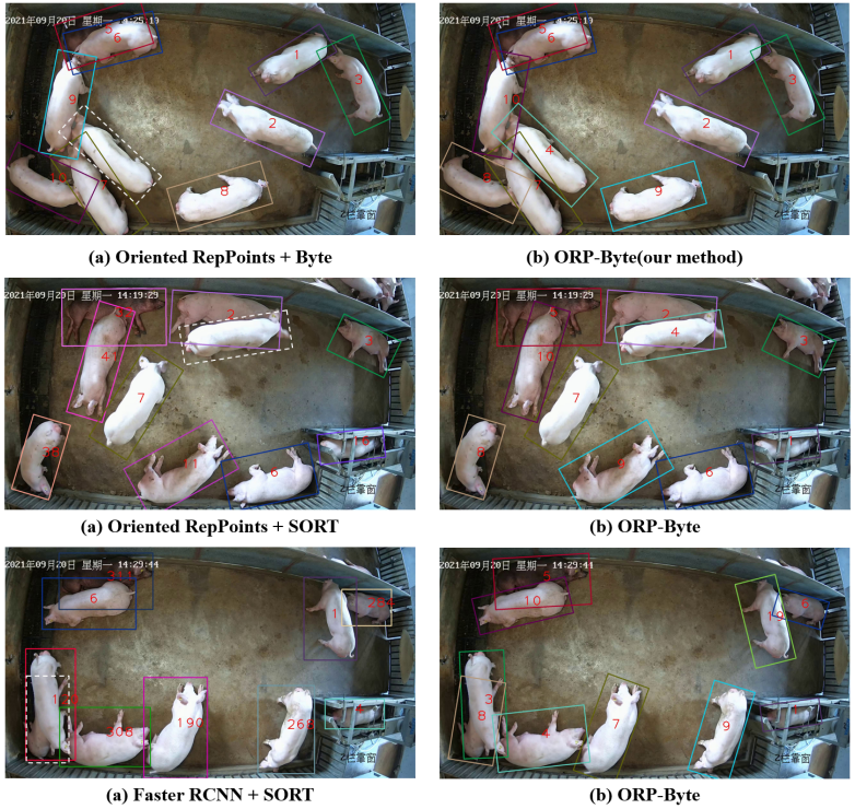 该研究在猪群跟踪数据集上对ORP-Byte进行了评估,并与其他多目标跟踪方法进行对比:ORP-Byte在检测精度仅为82.4%的情况下实现了99.8%的MOT准确度(MOTA)、16的IDSW、91.6%的身份F1分数(IDF1);该方法在MOTA、IDF1、HOTA等多个指标上均优于现有多目标跟踪方法,如SORT算法和DeepSORT算法。此外,该方法还支持5帧/秒的低帧率视频的猪只目标跟踪。结果表明,该方法能在群养环境下准确实时地追踪每头猪的轨迹、高精度地识别每头猪的身份。