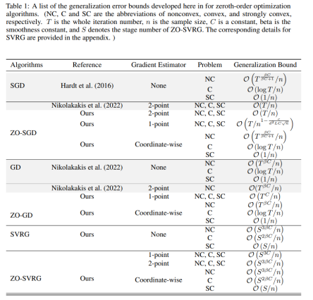 目前,零阶优化算法的计算收敛性已有较广泛研究,然而统计泛化性的分析还相对欠缺。该研究基于算法稳定性与泛化性的内在理论关联,较系统地探讨了零阶优化算法的泛化性能。具体来说,突破已有高斯分布两点估计器的局限,提出了适用于凸、强凸和非凸条件的稳定性分析框架,建立了零阶随机梯度下降(ZO-SGD)、零阶全梯度下降(ZO-GD)和零阶随机方差缩减(ZO-SVRG)等零阶优化算法的泛化误差上界。相关具体分析结果如下表所示: