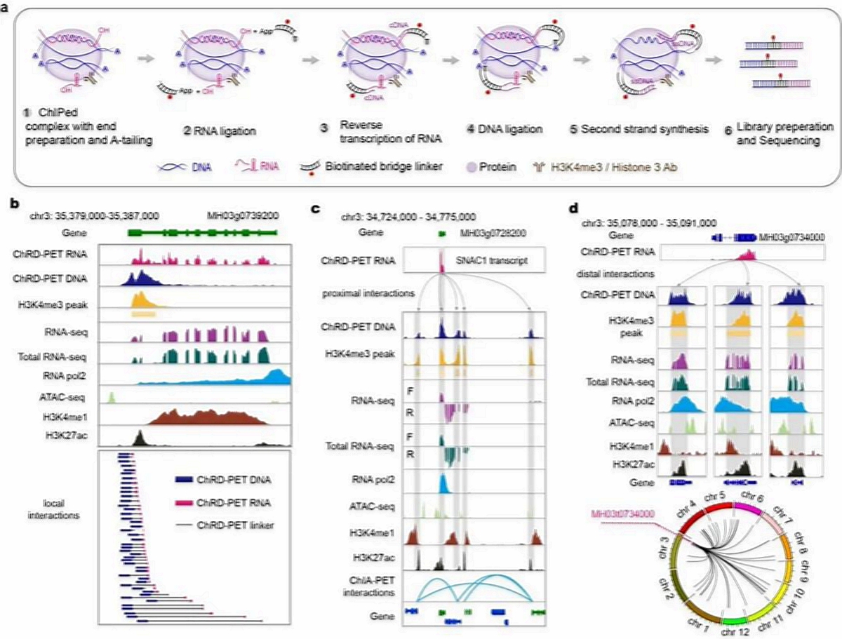 研究首先报道了一种植物RNA-DNA互作研究技术——ChRD-PET(Chromatin-associated RNA-DNA interactions followed by paired-end-tag sequencing), 其主要原理是利用特异组蛋白修饰抗体,通过染色质免疫共沉淀富集DNA-RNA-蛋白质复合物,用一种生物素标记的DNA bridge linker,将复合物上空间接近的RNA和DNA进行连接,通过高通量测序获得DNA和RNA交互的数据。利用这一技术,研究人员构建了水稻H3 ChRD-PET和H3K4me3 ChRD-PET数据,分别表征染色质结合RNA在全基因组上的结合位点,以及染色质结合RNA与H3K4me3修饰区域(标记水稻活跃启动子)的互作图谱。进一步系统地分析了RNA与染色质交互的基本特征。