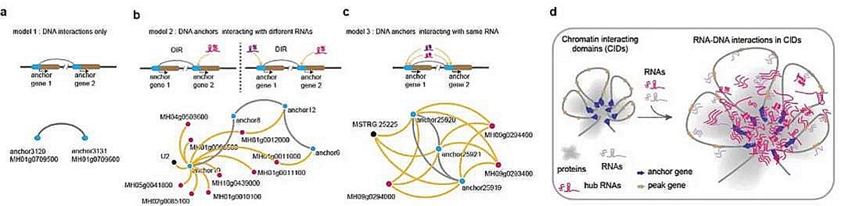 此外,通过与水稻表观基因组数据联合分析,研究人员揭示了预测增强子可以招募更多的RNA来交互,同时本身也转录更多的RNA去参与交互。进一步与水稻的三维基因组H3K4me3 ChIA-PET数据整合分析,发现RNA与染色质环存在三种交互模式:染色质环的gene上没有RNA交互、染色质环的gene上有不同的RNA交互、染色质环的gene和同一RNA交互。此外,在水稻染色质交互的拓扑结构中,一个基因转录的RNA可以和这个结构中一半以上的DNA有交互,共鉴定了614个这样的拓扑结构域 。