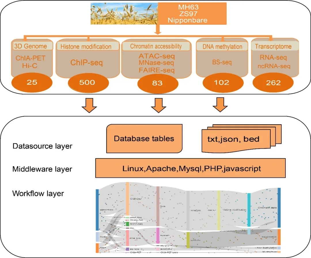 水稻(Oryza sativa L.)是我国乃至世界重要的粮食作物,同时也是基础研究的重要模式植物。水稻基因组DNA顺式调控元件的注释和鉴定,对理解水稻基因表达调控机理有重要意义。因此,一个整合了水稻多元表观基因组数据的数据库,将极大地方便研究人员查询和分析水稻的表观遗传信息,促进水稻表观和三维基因组研究。