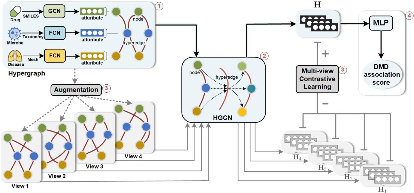 现有研究表明识别药物、微生物和疾病之间的潜在联系,对于探索微生物相关疾病的发病机制、发现微生物相关疾病的治疗药物、实现精准医疗具有重要意义。目前,已有研究工作分别预测药物-微生物、微生物-疾病关联二元关联,无法直接预测药物-微生物-疾病(DMD)三元关联。因此,研究者希望借助超图神经网络(HGNN)来捕捉DMD超图背后的高阶交互模式,实现对三元关联的精准预测。然而,现在已知的DMD关联不足,形成的DMD超图较为稀疏,泛化能力欠佳。针对这一问题,研究团队在DMD超图上设计了一种新的多视图对比学习(CL)作为辅助任务,引导HGNN学习更多的判别表征,增强其泛化能力,最终构建了一种多视图对比学习超图神经网络,称为“MCHNN”,用于DMD关联预测。