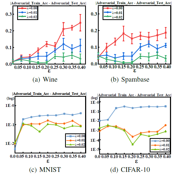 图2. 对抗度量学习算法在施加〖 L〗_1正则(λ≠0)和无L_1正则(λ=0)约束下的经验泛化误差
