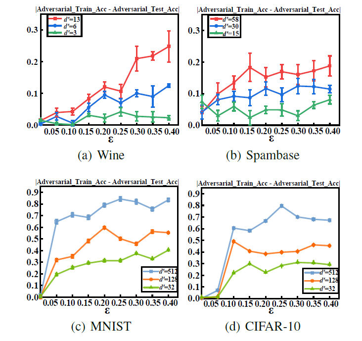 图1. 对抗度量学习算法在不同映射维度(d')下的经验泛化误差