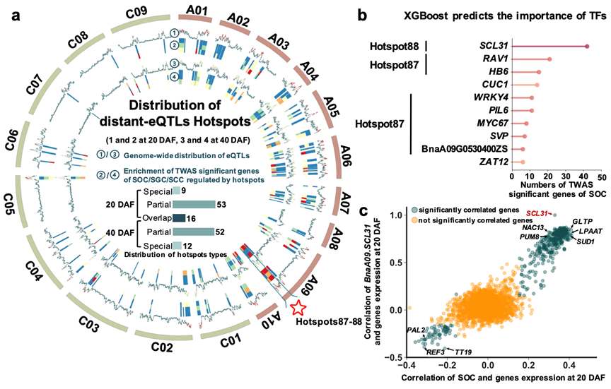 此外,本研究鉴定了141个热点eQTL,并且在A09染色体上确定了一个影响含油量的关键热点,69.73%的含油量全转录组关联分析显著基因的eQTL与该热点共定位(图2)。为了进一步预测该热点中影响含油量的关键调控因子和调控网络,该研究使用了856个RNA-seq和59个ATAC-seq数据集构建了XGBoost和Basenji模型,预测并验证了转录因子NAC13和SCL31是含油量的正向调控因子。