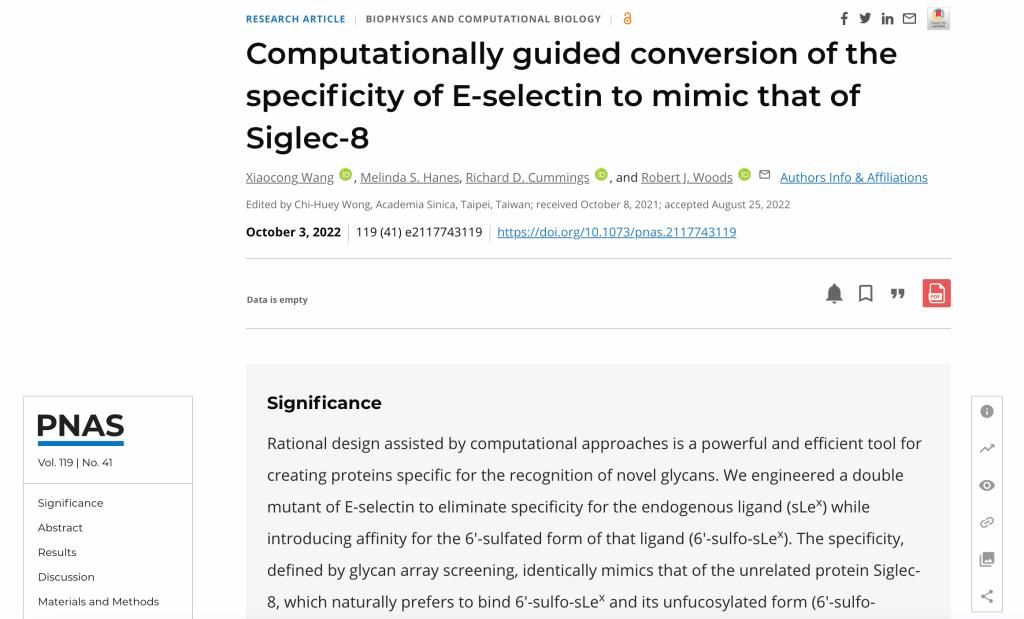 研究团队以白细胞表面的E选择蛋白为目标,对其进行分子模型的建模和分子动力学模拟,揭示E选择蛋白与唾液酸路易斯-X糖(sialyl Lewis X, sLex)结合,但其6’-硫酸化衍生物(6’-sulfo-sLex)中的硫酸根与结合区域内的两个谷氨酸(E92和E107)相互排斥,导致E选择蛋白不与该6’-硫酸化衍生物结合。研究团队在E选择素的分子模型中对谷氨酸进行突变,消除其与硫酸根的相互排斥。研究发现,突变其中单个谷氨酸(E92A或者E107A)都不足以消除相互排斥;但是,双突变(E92A/E107A)不仅可完全消除原有的排斥相互作用,同时可引进新的与6’-硫酸根的相互作用,增进E选择蛋白与6’-sulfo-sLex的相互作用。哈佛大学Cummings教授课题组通过多糖微阵列技术(Glycan Microarray)证实了理论模型的预测,并发现突变改造后的E选择素产生了只针对6’-sulfo-sLex的结合特异性。研究团队通过进一步研究,提出蛋白工程中引入对特定配体的结合特异性,不仅需要消除对目标配体的排斥与增强对目标配体的结合,同时需要降低对蛋白原生配体的结合。