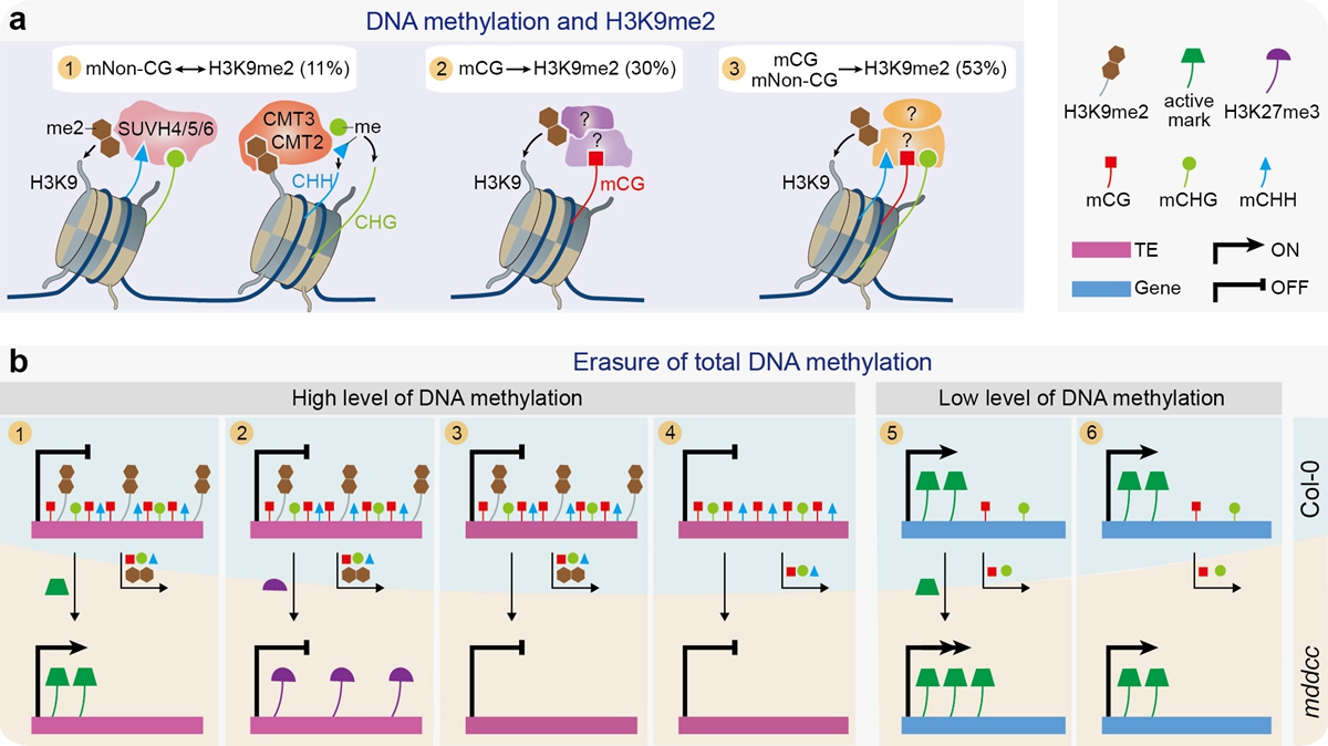 DNA甲基化在动植物中非常保守,与组蛋白修饰等表观修饰共同塑造染色质状态,在基因转录、基因组稳定性和生长发育等过程中发挥重要作用。由于缺乏完全无DNA甲基化的材料和相关技术不足,人们对DNA甲基化与组蛋白修饰间的协作关系及其功能的认知受到限制。