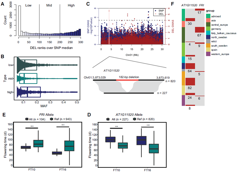 有48.91%的DEL与周围的SNP具有低连锁不平衡(LD),说明IndelEnsembler鉴定到了大量新的基因组变异,为挖掘影响拟南芥性状相关的基因组变异提供了重要资源。例如,该研究鉴定到的一段377 bp的DEL造成开花期相关基因FRI第一个外显子上65 bp的缺失,含有该缺失的材料开花期提前。另外该研究还鉴定到AT1G11520基因上的一段182 bp缺失,含有该缺失的材料开花期推迟。值得注意的是,上述两段缺失不能在同一个材料中出现而且所有北瑞典地区的材料AT1G11520基因上均含有该182 bp的缺失。这些结果说明拟南芥中仍然存在不少未知的基因组变异,IndelEnsembler鉴定到的大片段InDel可以作为拟南芥中表型相关的基因组变异数据集的一个补充。