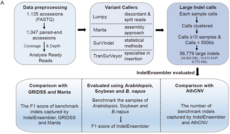 在植物中,大量的遗传学和分子生物学证据表明大片段InDel在解释影响一系列重要农作物的表型变异中起主要作用。例如,黄瓜基因组上一个大片段DNA序列拷贝数变化可以决定黄瓜的性别,包含该变异的黄瓜产量约为普通黄瓜的15倍。蟠桃因其果形独特,味甜多汁而受到人们喜爱,研究发现蟠桃基因组中含有一个1.67 Mb的倒位,而普通桃中则没有。但是,目前鉴定到的表型相关的大片段InDel的数量远远小于SNP,其主要原因是现有的方法不能精确的鉴定基因组上的大片段InDel。该研究通过整合四个已发表的方法开发出高性能的大片段InDel鉴定工具IndelEnsembler(//github.com/kensung-lab/IndelEnsembler),并将其应用于由1047个拟南芥品系构成的自然群体中,通过全基因组关联分析(GWAS)鉴定到与重要性状相关的、新的大片段InDel。