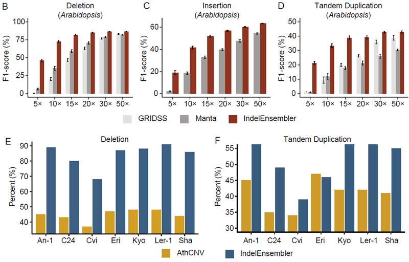 相比于目前鉴定InDel性能最佳的两个软件GRIDSS和Manta,IndelEnsembler在不同物种及不同测序深度下均有很好的性能。相比于拟南芥中已开发的工具AthCNV,IndelEnsembler在鉴定缺失变异(DEL)和重复变异(DUP)时准确性分别提高一倍和30%。