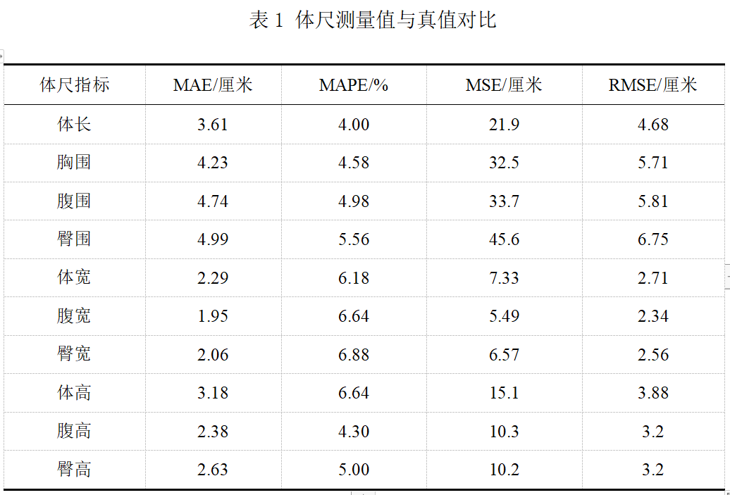 最后,完成点云精细分割后,本研究用体尺测量点定位和曲线曲面建模技术,开发出一套基于分割点云数据的猪体尺指标计算方法,实现了10项关键猪体尺指标的自动化精准测量。实验结果表明(如表1所示),与人工测量真值相比,所有体尺参数的 MAE 均低于 5 厘米,MAPE 控制在 7% 以内,展现出良好测量精度。其中,体宽、臀宽、腹宽和体长等指标的 MAE 和 MAPE 分别低于 3.61 厘米 和 6.88%,R² 值超过 0.64,进一步验证了该测量方法的准确性与可靠性。
