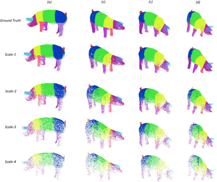 为进一步评估PointVector++模型在复杂数据条件下的鲁棒性及其性能表现,本研究基于猪点云数据集构建了四个不同稀疏尺度的测试场景:尺度1(50,000点)至尺度4(3,500点),其中各尺度分别对应原始点云密度的100%、40%、16%和7%。值得注意的是,在尺度3(8,000点)和尺度4(3,500点)条件下,图3所示的可视化结果清晰表明,PointVector++分割模型在应对不同尺度和密度的点云数据时均展现出良好分割性能。