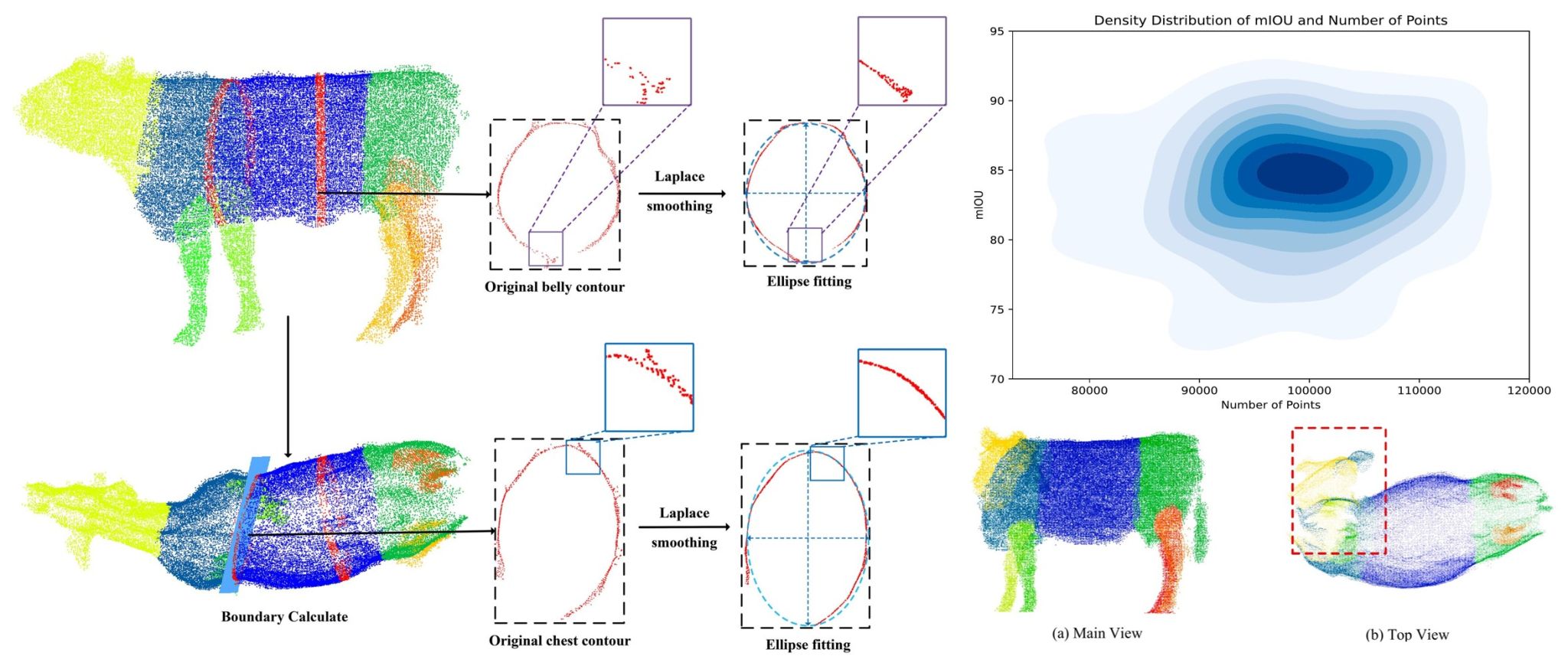 团队围绕现代畜牧业中奶牛体型精准测量这一问题,面对传统人工测量效率低下且易受动物姿态影响的行业痛点,创新性提出基于深度学习的像素级点云分割模型与自适应关键切面识别算法,为实现规模化养殖场奶牛生长监测自动化提供了可靠技术方案。该研究通过构建FGPointKNN++分割模型和AKCPR关键切面识别算法,实现不同姿态下奶牛像素级点云分割(mIoU达83.24%)与体尺参数自动测量。