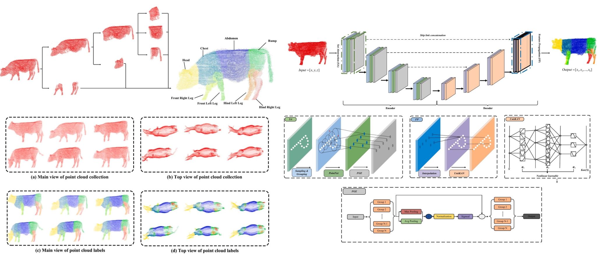 图1 牛三维点云分割可视化数据集与FGPointKAN++网络结构