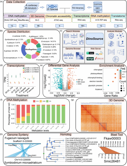 甲藻是一类在分类学上具有高度多样性、在珊瑚礁生态系统中占据关键地位的浮游植物群体。不正常的甲藻生长会引起有害藻华,对生态与经济有重大影响。该研究工作整合了来自20种甲藻物种的参考基因组和基因组注释数据以及 703个多组学数据集,涉及表观基因组数据(如 DIP-seq、BS-seq、ATAC-seq、RIP-seq)、染色质构象数据(Hi-C)、转录组数据(RNA-seq)和翻译组数据(Ribo-seq)。每项数据均依照标准化分析流程进行处理,包括质量控制、比对至相应的甲藻参考基因组,以及在数据库网页界面上的结果可视化。多组学信号的可视化通过 WashU Epigenome Browser 实现,而三维基因组数据的高级可视化则借助 HiGlass 平台完成。