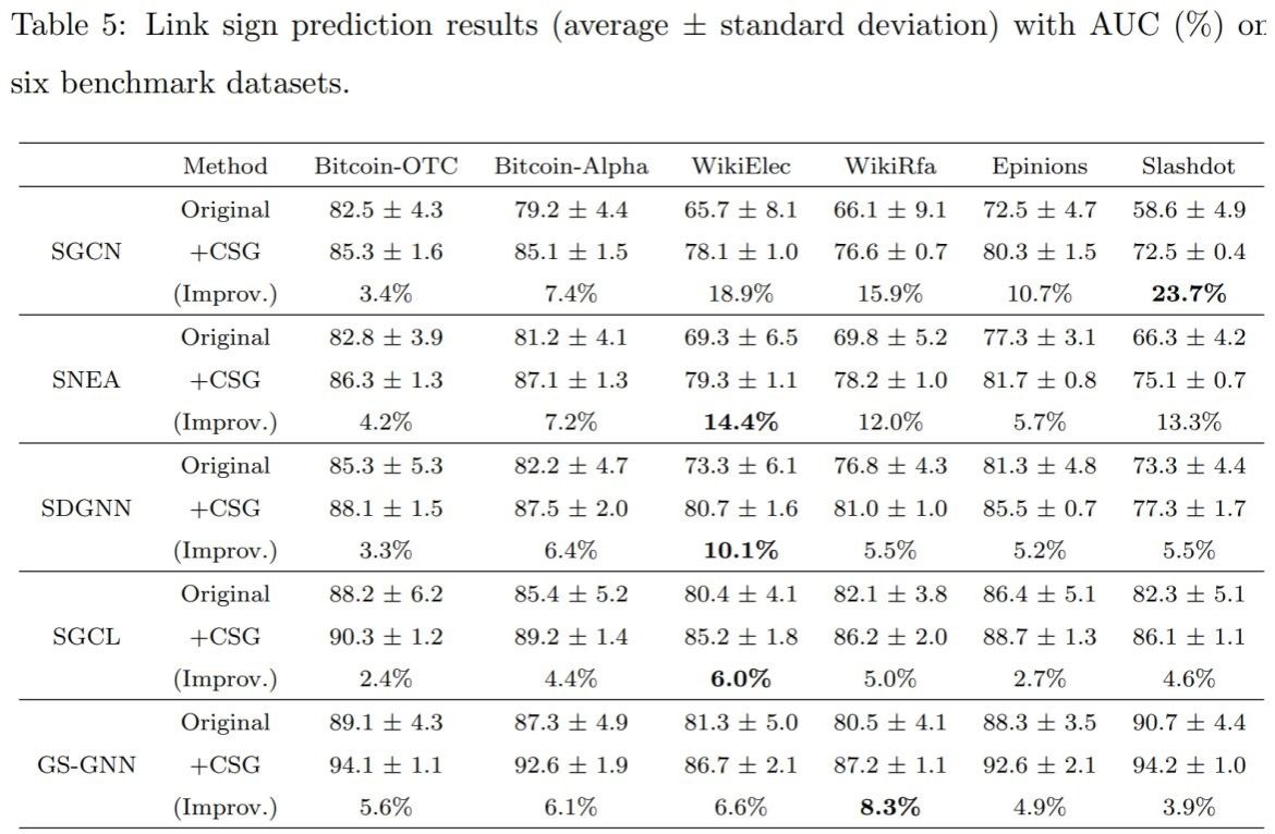 在比特币交易网络(Bitcoin-OTC)、维基百科管理员选举网络(WikiRfa)、科技新闻社区Slashdot等6个真实数据集上的实验结果显示,CSG对5种主流SGNN模型(SGCN、SNEA、SDGNN、SGCL、GS-GNN)均有显著提升。其中,在Slashdot数据集上,SGCN模型的AUC指标从58.6%跃升至72.5%,提升幅度达23.7%;在WikiRfa数据集上,模型标准差降低8.4%,稳定性大幅增强。