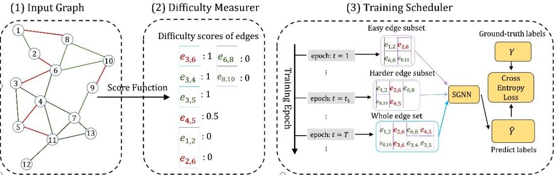 符号图是一种能够同时表示“正向关系”(如好友、信任、上调表达等)和“负向关系”(如敌人、不信任、下调表达等)的复杂网络模型。近年来,符号图神经网络(SGNN)被广泛应用于社交推荐、加密货币反欺诈、基因调控网络推断等任务。然而现有SGNN训练方法通常将所有样本(边)随机输入模型,忽视了不同样本在学习难度上的巨大差异,导致模型难以有效学习复杂结构中的信息。