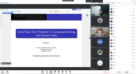 李松教授以简明扼要的语言为师生们讲述了压缩感知、矩阵恢复等重要研究课题的背景、发展历程和核心研究要点,并阐述了调和分析、函数逼近论等分析方法应用到压缩感知领域中的关键技巧和思想。李松教授介绍了他与合作者对于若干个公开问题的一些启发性思考和探索。