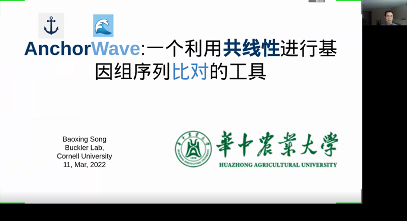 宋宝兴博士先介绍了基因组比对工具的研究现状。他指出当前比对工具主要针对动物基因组开发,应用于植物基因组时,其结果往往和其他生物学研究结果相差甚远。接着,宋博士分别就全基因组复制、功能元件核心motif和转座子重复序列三个方面解释了当前比对工具的不足之处。为解决这些难题,宋博士课题组最近开发了一个新的比对工具:AnchorWave。接着,宋宝兴博士介绍了AnchorWave工具背后的算法原理;并展示了多个AnchorWave的使用案列,显示AnchorWave相较于minimap2、MUMmer等主流的基因组比对软件效果更优或相当。最后,宋博士指出AnchorWave不仅有较高的比对率,而且能够产生符合全基因复制进化预期的序列比对深度,显著提高调控序列区域的比对率,并降低转座子区域的假阳性。据悉,宋博士的本次报告的主要内容以“AnchorWave: Sensitive alignment of genomes with high sequence diversity, extensive structural polymorphism, and whole-genome duplication”为题,最近发表在国际知名学术期刊 Proceedings of the National Academy of Sciences (PNAS) 上。
