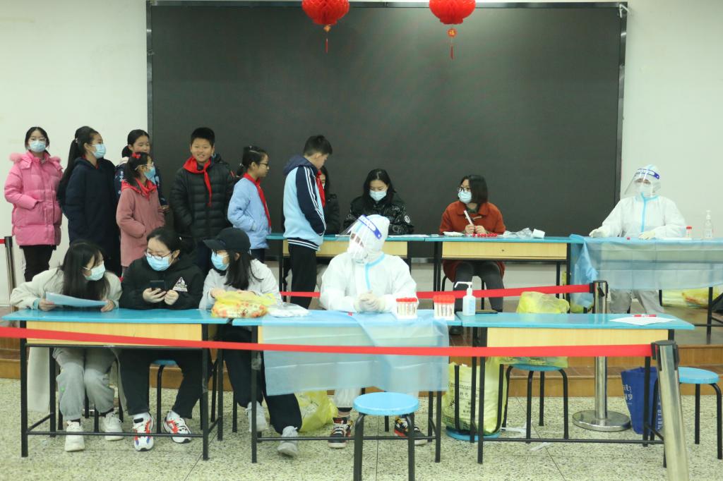 上午9:00,本轮核酸检测工作正式开始,在老师和志愿者们的共同组织下,采样现场井然有序。本次志愿者们的主要工作分别是按照顺序通知各班同学到大厅集合,随后由志愿者进行十人一组分组,并带领到阶梯教室进行采样;采样现场的志愿者们认真核对信息后向小朋友们发放采样拭子和样品采集管。