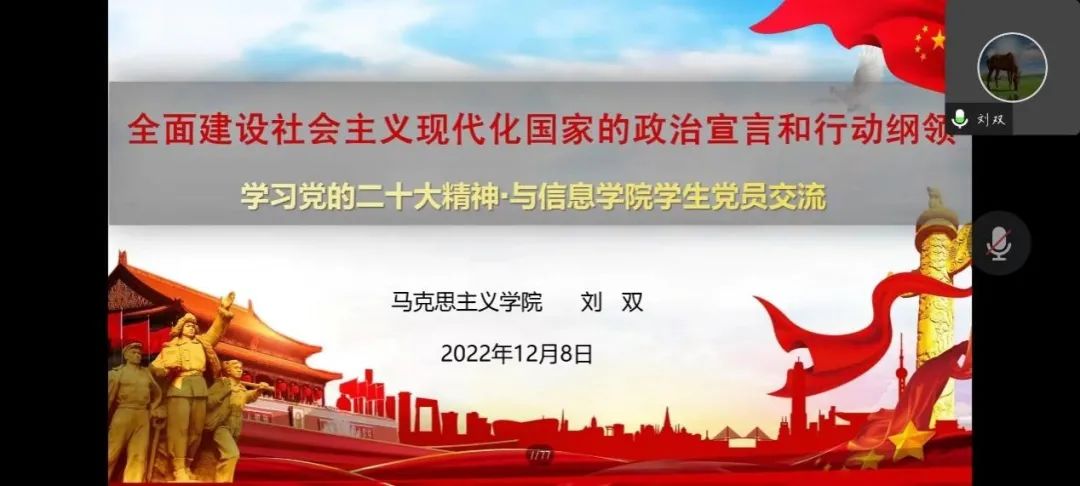 第二部分关于全面准确学习领会党的二十大精神,刘双老师从二十大报告起草开始说起,“以网为媒,问计于民”充分体现了二十大报告起草集中体现了新时代党和人民的实践经验和理论创新成果,是充分发挥党内民主和全过程人民民主、集中全党人民智慧的结晶。介绍了二十大的总体结构。通过七个方面让同学们全面了解学习了党的二十大精神。