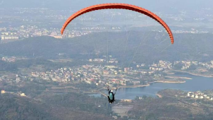华伍村四峰山生态农庄(左)与游客滑翔伞飞行(右)