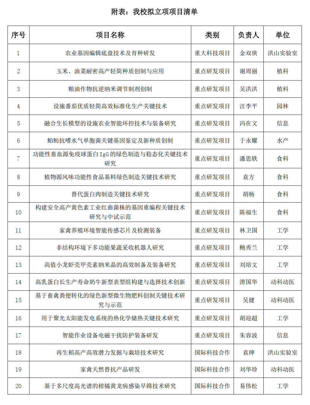 南湖新闻网讯(通讯员 叶世英)近日,湖北省科技厅公示了2024年度第一批省级科技计划立项项目,我校和洪山实验室获批立项重大、重点项目20项。从立项项目类型看,重大科技项目1项,重点研发项目16项,国际科技合作项目3项。立项项目研究领域涉及农业技术17项,高新技术2项,社发技术1项,青年科技人才主持项目比例为47%。此外,我校联合东风井关农业机械有限公司以企科模式获批重大科技项目1项。