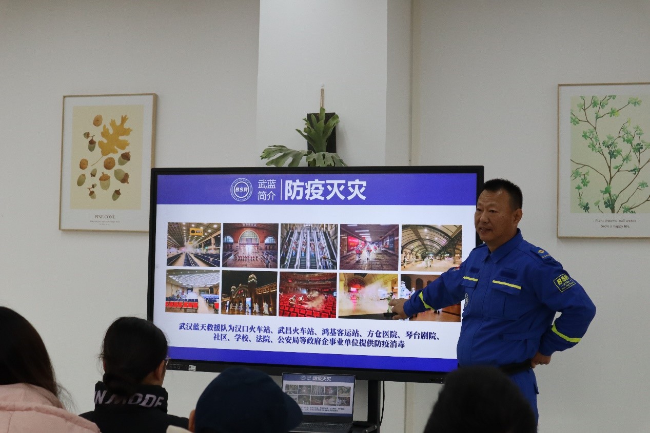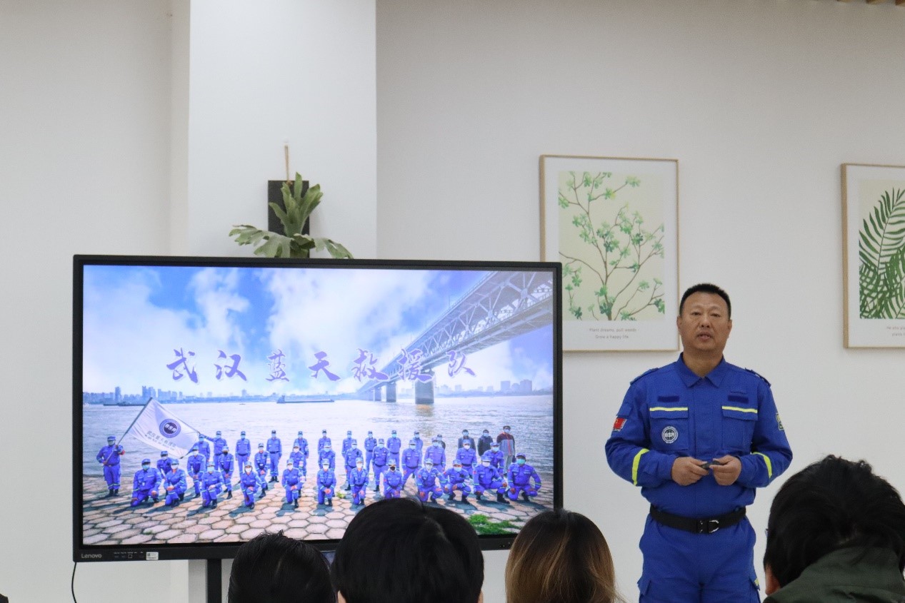 图2 武汉蓝天救援队医疗组组长曹阳向大家介绍队伍职责