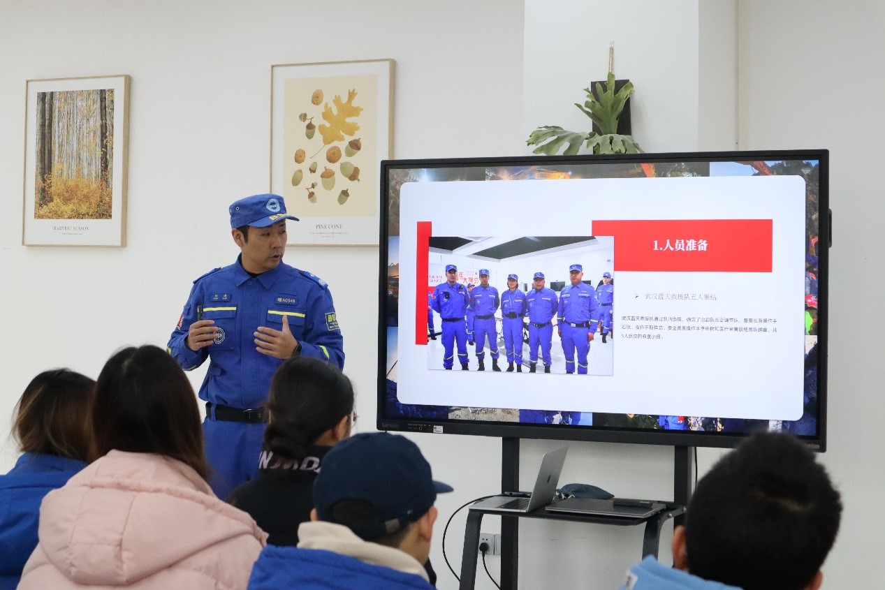 图4-5 武汉蓝天救援队副队长彭谦向大家分享土耳其地震救援事例