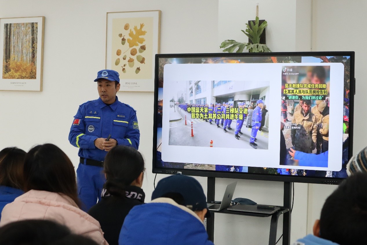 彭谦是武汉蓝天救援队的副队长,曾参与过2019年湖北省江陵县沉船打捞、2020年武汉新冠抗疫消杀及物资转、2023年土耳其地震救援等救援任务。在分享会上,彭谦着重讲述了自己参与土耳其地震救援的故事。2023年2月6日,土耳其发生7.8级地震,2月8日,武汉蓝天救援队队员携带高科技装备驰援土耳其。一到达地震灾区,救援队队员们便迅速投身到救援工作中,全力搜救被困者,并为当地提供紧急医疗救助。“地震现场到处都是废墟,我们只能一遍遍地拿着雷达生命探测仪进行搜索,期望能够捕捉到废墟下的生命信号。”彭队长回忆,现场除了他们在内的搜救人员,还有众多土耳其民众24小时不间断地守在那里,他们是受灾群众的亲人朋友,无一不渴望听到搜救队员们带回好消息。“任务结束后,土耳其当地的居民们自发地排起队伍为我们送别,机场的工作人员也纷纷向我们张开手臂,给我们一个紧紧的拥抱。那一刻,我的内心也是无比的感动与动容!”