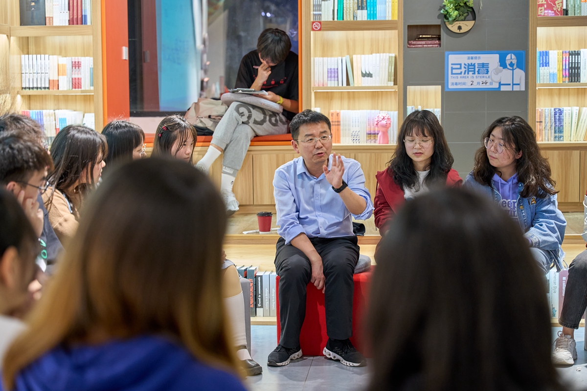 严建兵与同学们围坐,畅所欲言。他逐一了解并回应了同学们关于学业、人生等方面的迷茫和困惑,并勉励同学们在青春正好的大学里多读书、读好书。