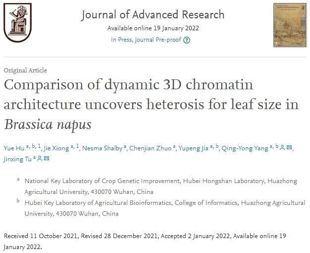 (图文|辛西 审核人|杨庆勇)近日,华中农业大学涂金星教授和杨庆勇教授团队在国际学术期刊Journal of Advanced Research上发表了题为“Comparison of dynamic 3D chromatin architecture uncovers heterosis for leaf size in Brassica napus”的研究论文,首次从染色质三维结构的视角下探究甘蓝型油菜杂种优势的潜在影响机制。