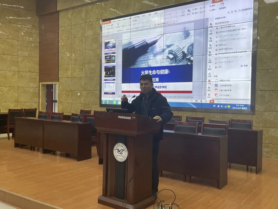 “人类为什么要探索外太空呢?”“真的存在外星人吗?”“三体中是否有违背科学的内容存在呢?”报告一开始,张红雨教授就通过几个学生感兴趣的问题,开启了今天的火星探测之旅。从地外生命探测,到土星木星可居住性分析,再到中国火星探测任务,“祝融号”传回新照片,张红雨教授分别从火星历史火星生命标志物检测、空间生存模拟等方面进行了讲解。他还向同学们介绍了华农火星生命与健康团队的研究成果,展示了我校优秀校友廖国瑞的风采,担任长征五号B遥二运载火箭发射任务的“01”指挥员,借此激发同学们的科研兴趣和报国热情,鼓励大家走进华农、走近科学、走向未来。报告结束,张红雨教授还与现场学生进行了提问互动。