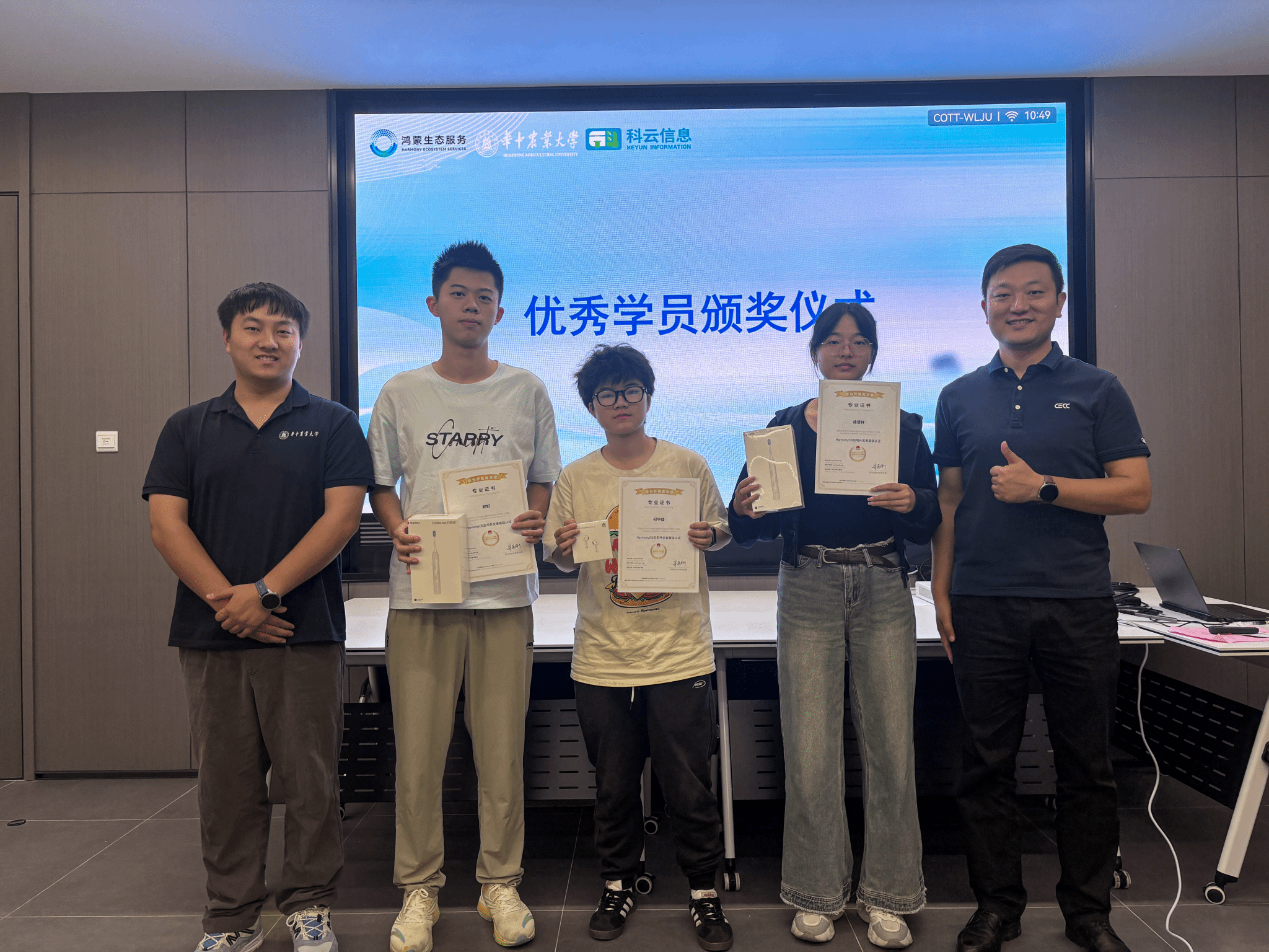 9月19日,培训结业仪式顺利举行,仪式上,在我校与鸿蒙生态(武汉)创新中心、武汉科云信息技术有限公司三方代表的共同见证下,为本次培训中优秀学员颁授“优秀学员”荣誉证书及专属奖励。