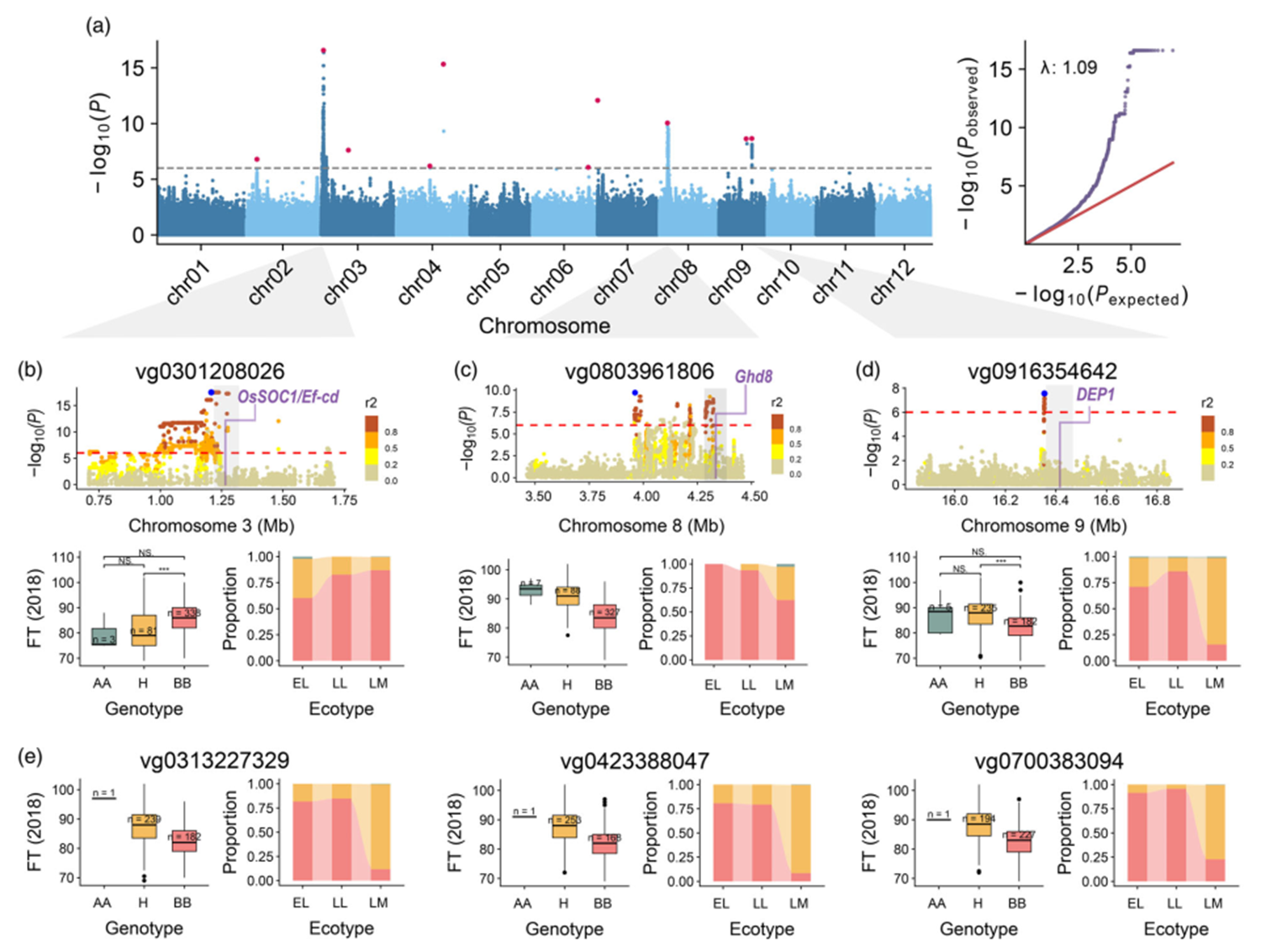 该研究进一步揭示了杂交籼稻中ATI的遗传基础。通过对422份材料进行全基因组关联分析(GWAS),鉴定到10个与ATI变异显著关联的基因组位点(图2a)。其中,两个位点分别位于已知的抽穗期基因OsSOC1/Ef-cd和Ghd8附近,一个位点位于DEP1附近,揭示其附近可能有未知的影响积温的基因。特别有趣的是,研究发现4个位点与水稻生态型分化密切相关。利用这4个位点的基因型信息,就能以93.8%的准确率将杂交籼稻分为中籼和晚籼两个生态型,这一发现对杂交稻亲本的选配具有重要的指导意义(图2b-e)。