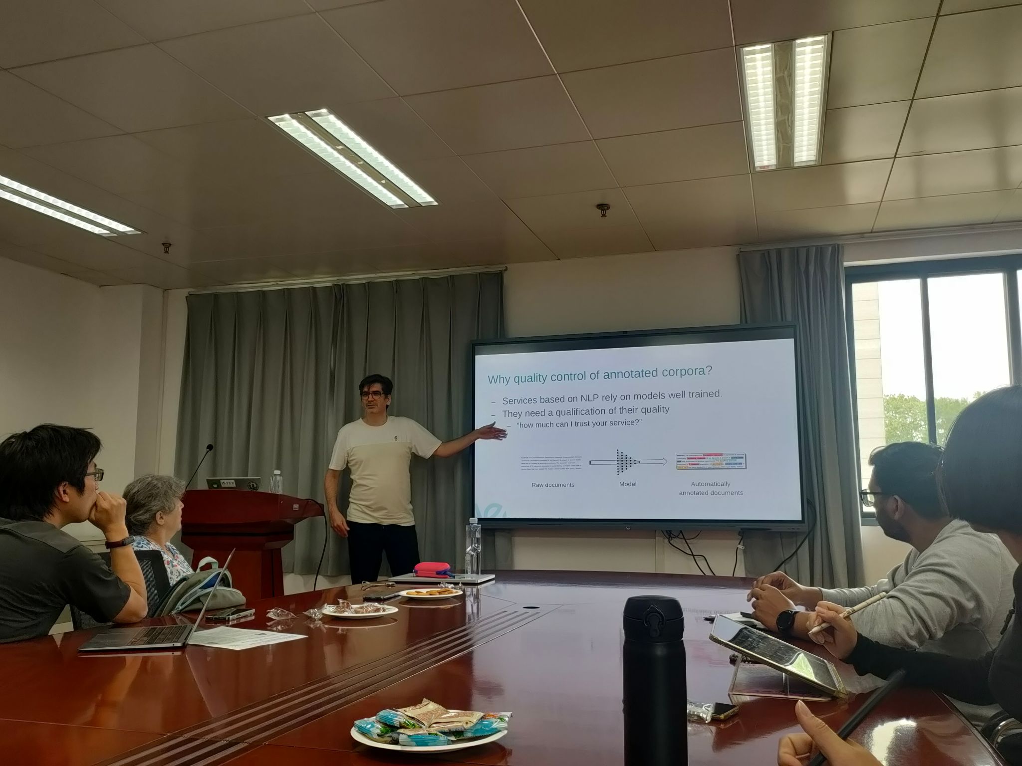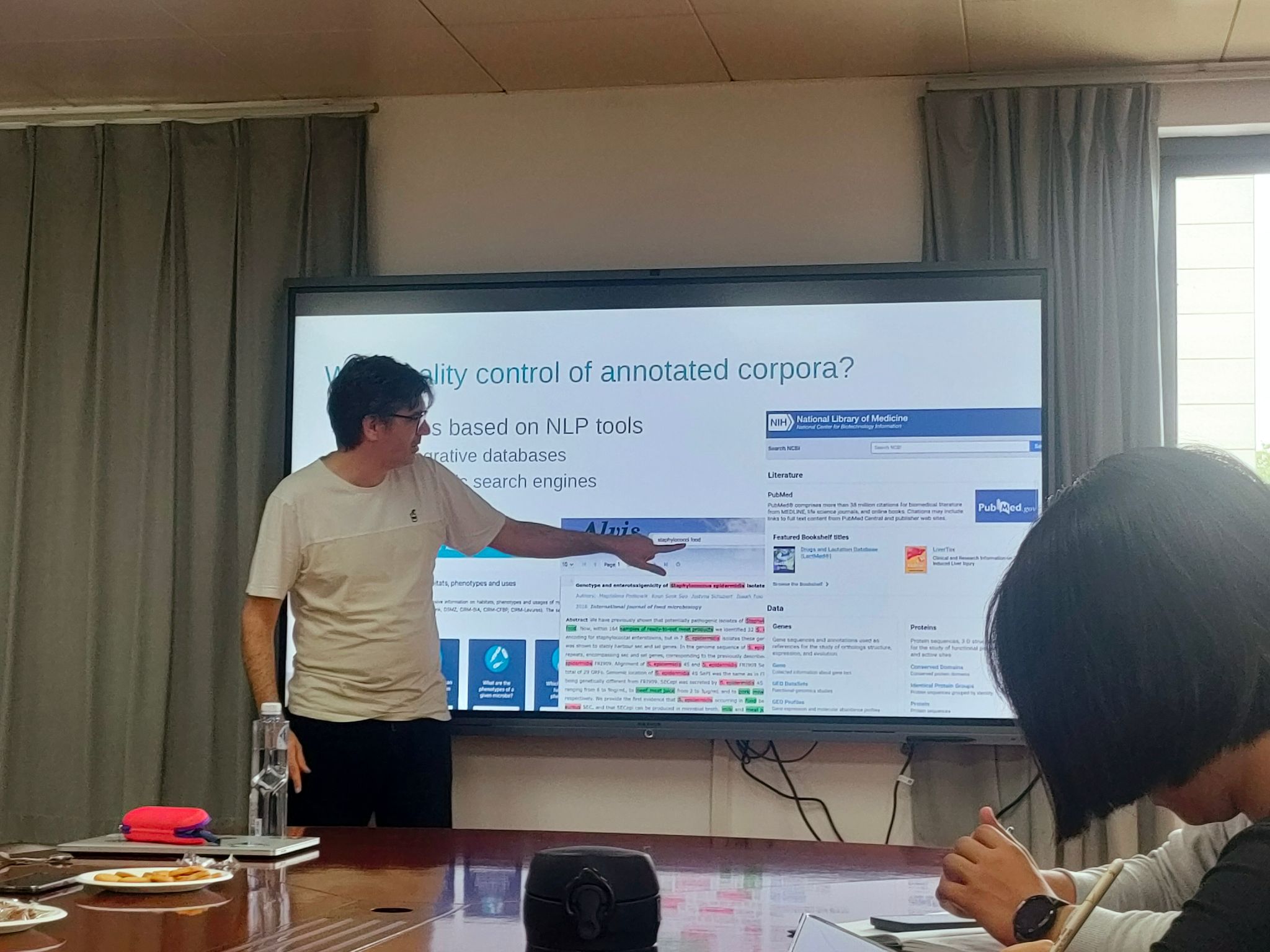 Robert Bossy博士则着重阐述了EPOP语料库的标注质控体系建设。在面对ESV平台积压的10万份文档时,团队采用分层抽样策略,选取最近三个月的500份文献作为代表,以捕捉农业健康趋势的最新变化。Robert博士详细说明了高质量语料库的重要性——不仅服务于语言学研究者的需求,也直接关系到NLP系统开发的标准性与稳定性。EPOP注释团队构建了一套完整的质量控制流程,包括五个关键步骤:第一,文献选择阶段采用系统抽样方法并评估翻译质量;第二,制定注释计划,在活动前阶段发布指南,确立基本标准;第三,通过组织措施强化团队协作,包括在线培训课程、Q&A机制、专用Google资源库等;第四,引入自动化检测机制,利用正则表达式识别关键词与模式(如时间戳、地理矛盾等),例如文本中同时出现“2025年4月”与“雨季病害”会被系统自动标记并触发复核;第五,在此基础上逐步形成EPOP标准语料库,该成果目前已通过ISO认证,成为农业NLP研究的标杆数据集。