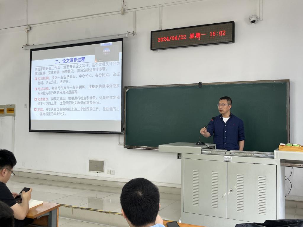 培训中,牛晓辉书记分别针对论文写作目的、写作过程、写作规范、数据处理与图表制作等内容进行详细介绍,特别强调了同学们在学术论文写作过程中容易忽略的问题,如各级标题的使用、参考文献的编写规范、图表的排布与清晰度、插图的色彩搭配等。此外,牛晓辉向同学们介绍了论文查重的标准,并强调了遵守学术道德规范、严禁造假和抄袭的重要性,督促、鼓励同学们认真完成毕业论文的撰写。