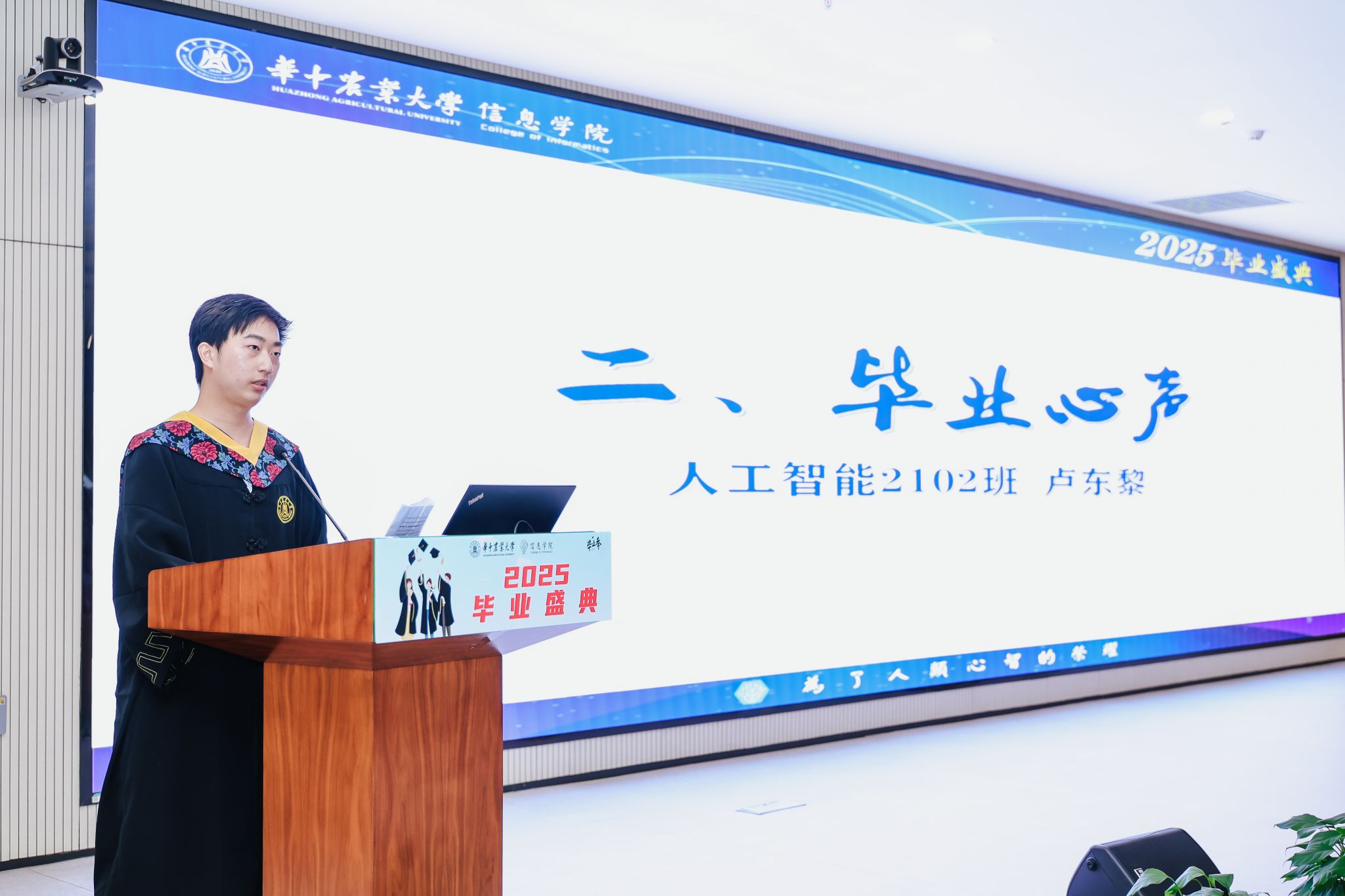 “过了今天,我们精彩的大学生活将画上一个圆满的句号。”人工智能2102班卢东黎作为毕业生代表发言,字里行间满是对母校的眷恋与感恩。作为人工智能专业首届毕业生,他回顾了四年来在多学科融合沃土中的蜕变:从课堂上推敲代码逻辑,到实验室优化模型至深夜;从竞赛场上临危协作攻克难题,到实习中实现理论与实践的转化。他特别提到,今天足球比赛比分 “为了人类心智的荣耀”的价值追求,让他们学会将技术扎根现实:无论是推动农业智能监测,还是参与医疗影像识别,“每一行代码都应指向增进人类福祉”。他以“行动破万难,敢闯第一步”勉励同窗,号召大家在未来“既做全球舞台的追光者,也做本土科技自立的担当者”,将个体选择融入集体奋斗,让生命因奋斗而丰盈。