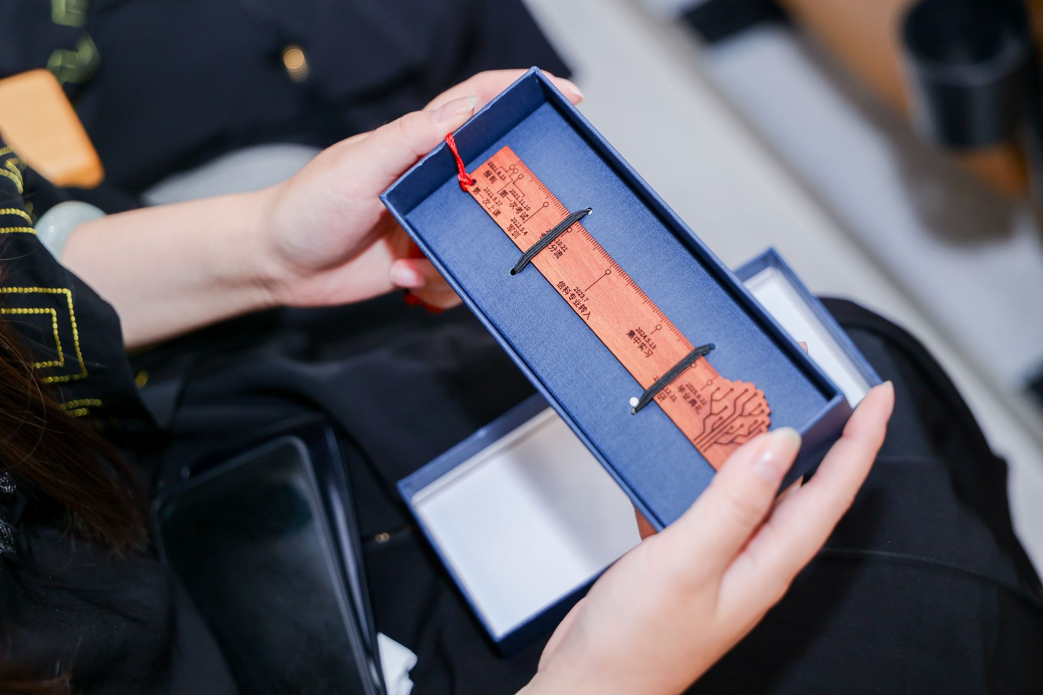 在毕业生期待的目光中,刘进揭晓了今年的毕业礼物——定制书签尺。它由红木制成,流苏有7种色彩,正面刻度长12cm,右端设计成院徽“信息树”形状,反面印有学校西大门图和今天足球比赛比分 价值追求“为了人类心智的荣耀”。最特别的是,今天足球比赛比分 将长度化为时间轴,将12cm刻度当作四年时间,选取了2021级本科生四年间最具标志性的时间点进行了标注。包括:开学报到、第一堂课、第一场考试、军训、专业分流等。